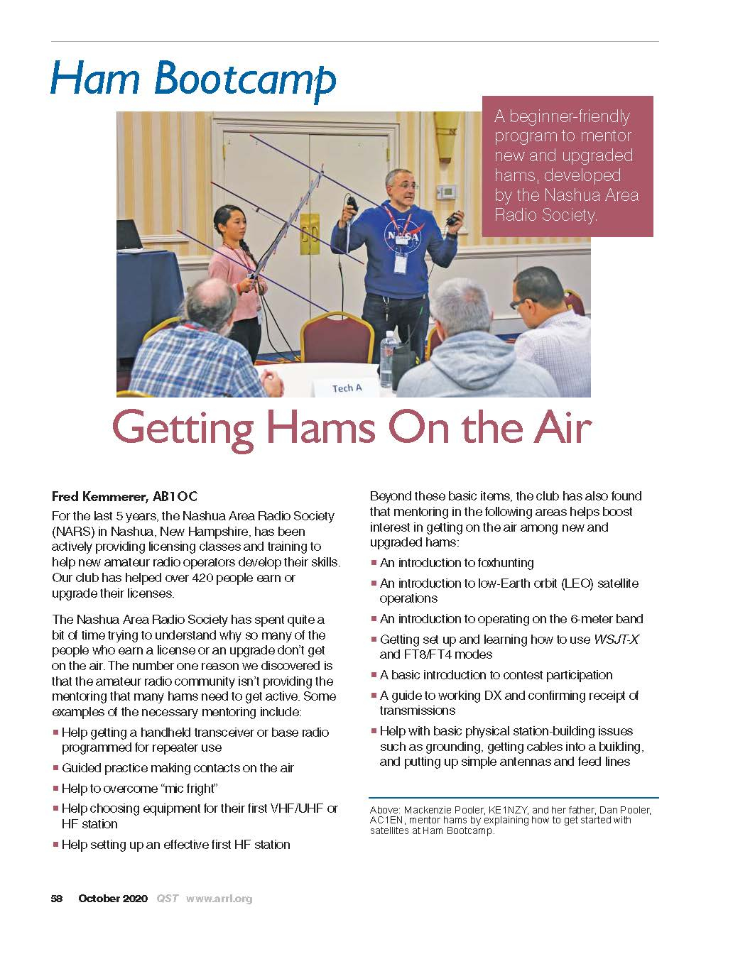 The winning article for the October 2020 QST Cover Plaque award is “Ham Bootcamp: Getting Hams On the Air” by Fred Kemmerer, AB1OC.