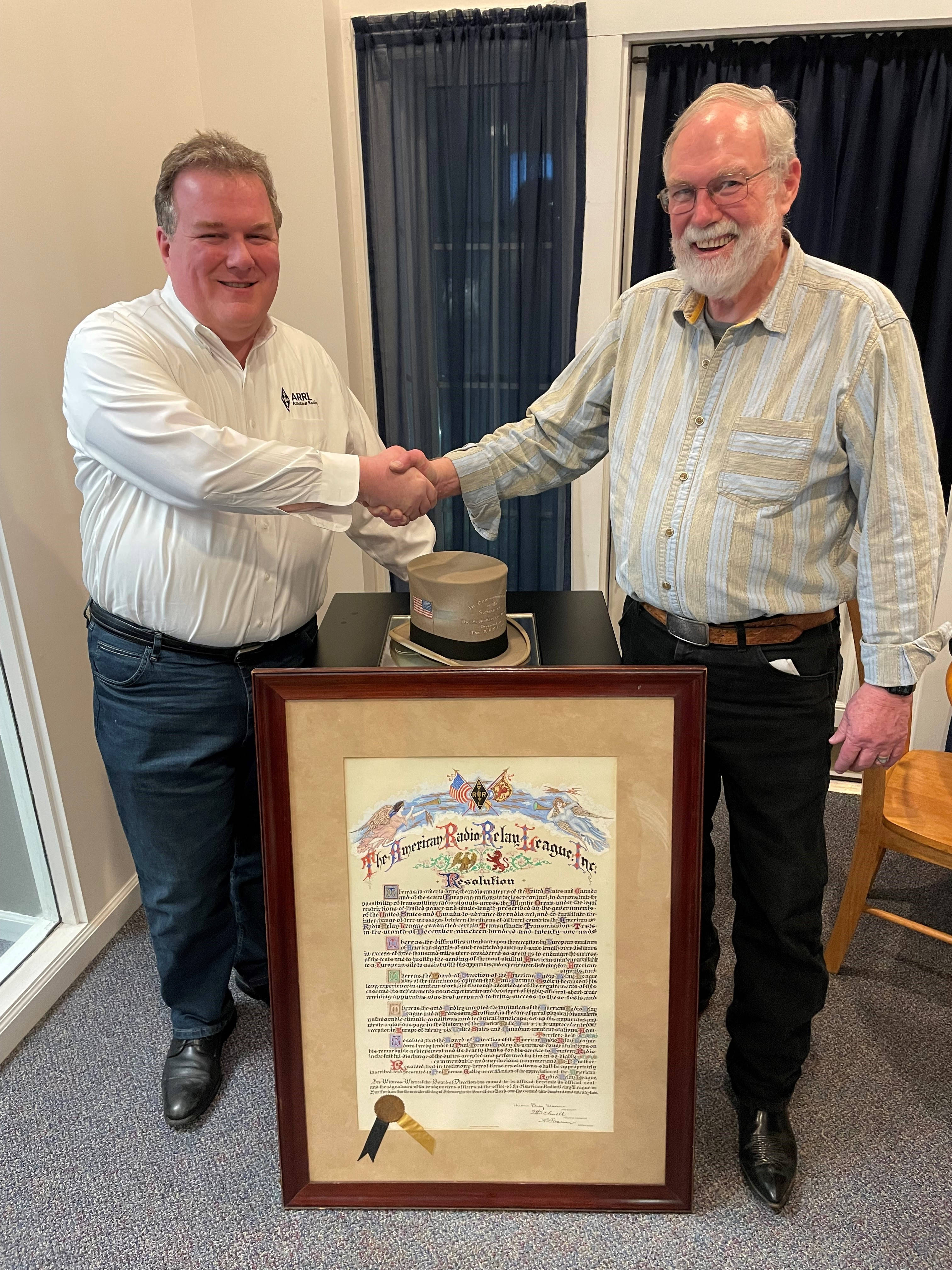 During the event, W1AW enjoyed a visit from Bruce Godley Littlefield, Paul Godley's grandson. Littlefield presented ARRL CEO David Minster, NA2AA, with a full-size gallery-quality copy of the resolution awarded to his grandfather by ARRL, dated February 17, 1922.