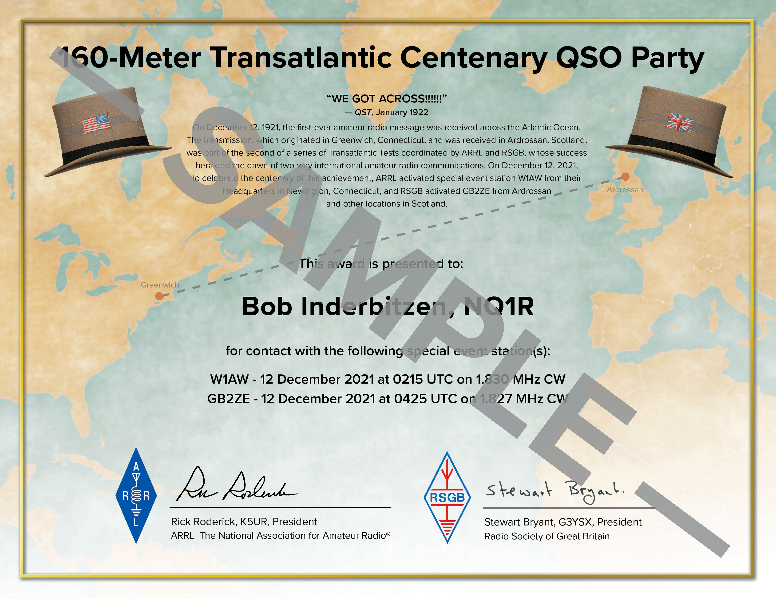 ARRL The National Association for Amateur Radio® and the Radio Society of Great Britain (RSGB) have announced winners of the 160-Meter Transatlantic Centenary QSO Party. The December 12 on-air event commemorated the 100th anniversary of the successful second Transatlantic Tests which contributed to the dawn of international amateur radio communication. Participating stations operating on CW attempted to contact the two official call sign activations, W1AW from the Hiram P. Maxim Memorial Station in Connecticut, and GB2ZE, activated by a team of stations in Scotland. GB2ZE recalls and commemorates the call sign of Paul Godley, 2ZE, whom ARRL sent to Scotland to be on the receiving end of the tests in 1921.