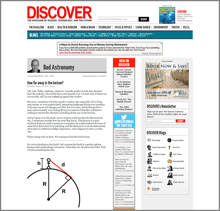 I discovered a great article about this topic years ago and after reading the article again, I realized that it was still good stuff. So without further ado, I refer you to Phil Plait’s blog post “How far away is the horizon?” on DISCOVER Magazine’s website.