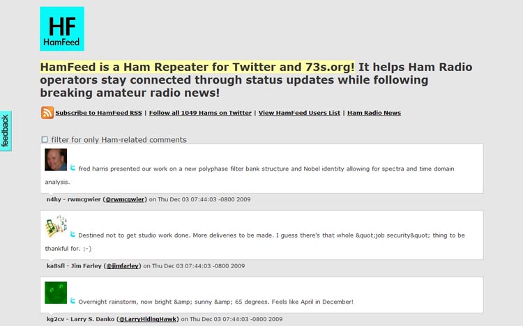 I also found HamFeed, an online repeater for tweets from hams. It includes a filter to display only ham radio-related comments.